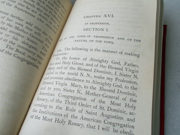 The Vow Formula as it appears in the 1889 Constitutions, substantially similar to the form in which it was given to the sisters by Father Mazzuchelli, their founder. “Congregation of the Most Holy Rosary” is the formal name of the Dominican Sisters of Sinsinawa.